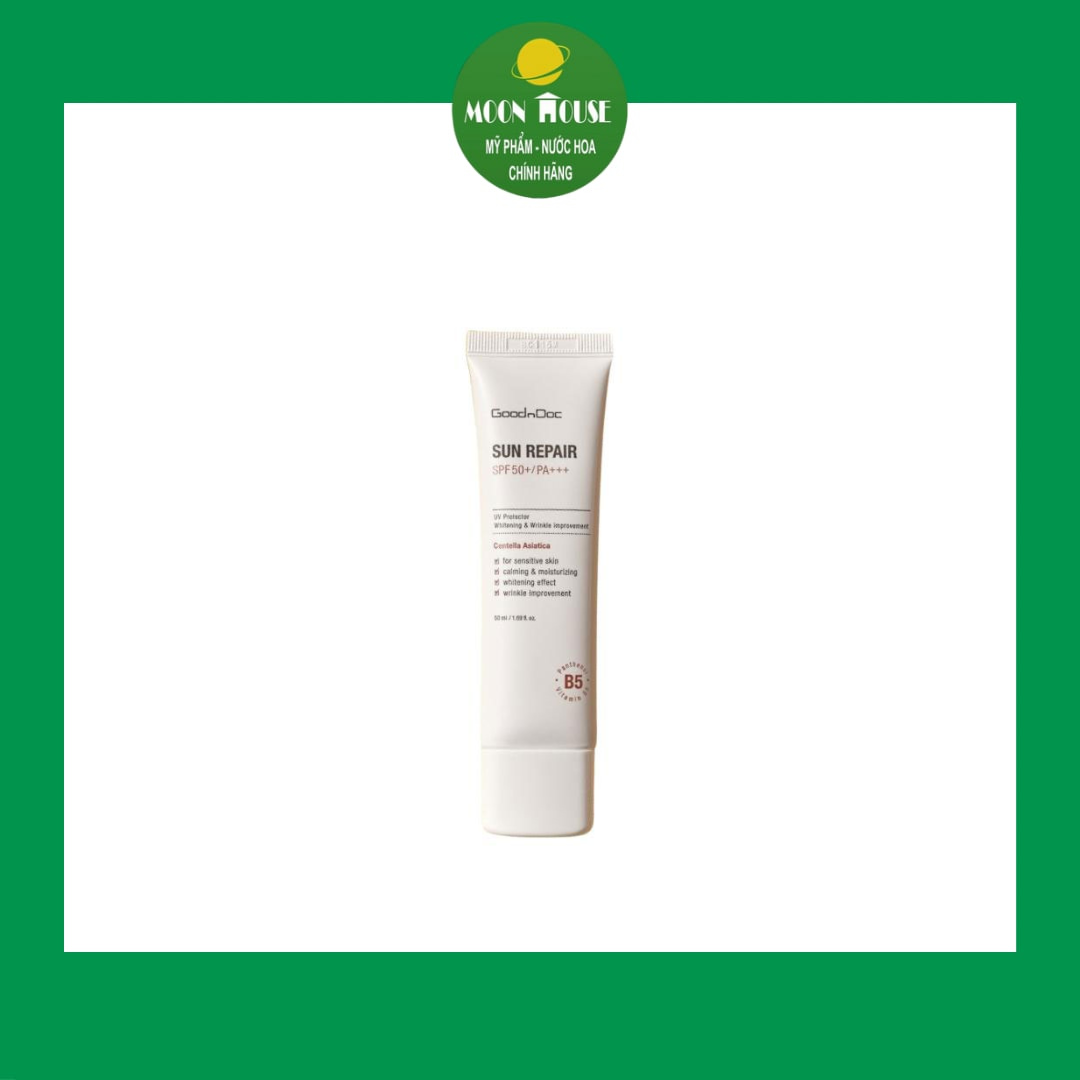 Kem Chống Nắng Nắng Phục Hồi Da GoodnDoc Sun Repair SPF50/PA+++ – 50ml Kem chống nắng Gooddoc Sun Repair SPF50/PA+++ 50ml với công nghệ cải tiến hiện nay – Kem chống nắng GoodnDoc Sun Repair SPF 50/PA +++ với công nghệ cải tiến, kết hợp chiết xuất rau má, tràm trà, Niacinamide (B3), Panthenol (B5),… không chỉ bảo vệ da trước tia UV từ ánh sáng mặt trời, mà còn dưỡng ẩm, phục hồi, phù hợp cho mọi loại da. – Với kết cấu lỏng, mỏng nhẹ hết hợp nâng tone da nhẹ nhàng, phù hợp với làn da người châu Á, kem chống nắng GoodnDoc Sun Repair SPF 50/PA +++ giúp làn da thêm rạng rỡ và tràn đầy sức sống. THÀNH PHẦN – Chiết xuất rau má – Chiết xuất tràm trà – Niacinamide – Panthenol CÔNG DỤNG – Bảo vệ làn da trước tia UVA, UVB và các tác nhân gây hại khác từ môi trường. – Nâng tone da nhẹ nhàng – Dưỡng ẩm, phục hồi làn da CÁCH SỬ DỤNG Bước 1: Sau khi dưỡng ẩm đầy đủ cho làn da, lấy một lượng kem vừa đủ cho toàn mặt và cổ ra tay Bước 2: Chấm đều lên da và tán kem nhẹ nhàng Bước 3:Vỗ nhẹ và đều để lớp kem chống nắng được bám vào da Bước 4: Tiếp tục các bước trang điểm tiếp theo (nếu có)