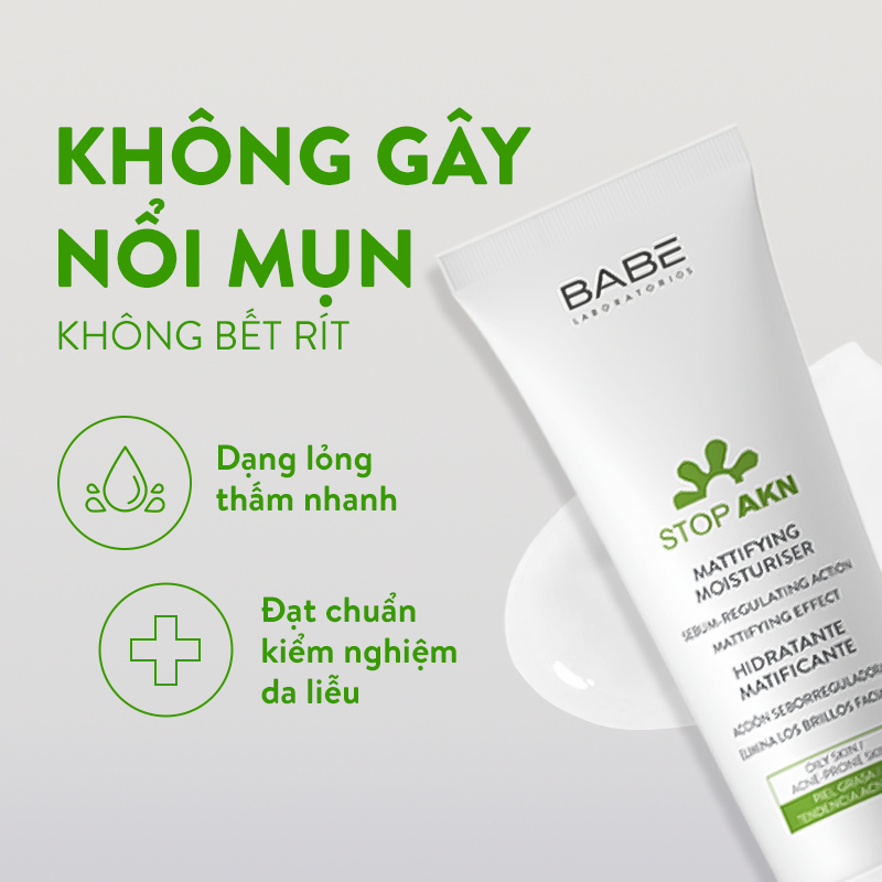 Kem dưỡng ẩm kiềm dầu giảm mụn BABE Stop AKN Mattifying Moisturiser là sản phẩm chăm sóc da dầu mụn giúp kiểm soát dầu thừa, giảm bóng nhờn và mụn trứng cá, đồng thời cung cấp độ ẩm cho da giúp da luôn tươi sáng, khỏe mạnh. Kem dưỡng BABE Mattifying Moisturiser được đánh giá là một sản phẩm hiệu quả và an toàn cho việc ngừa mụn trên da.