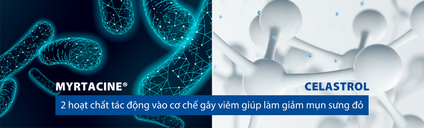 – Hỗ trợ ngừa khuẩn: Hiệu quả này tổng hợp từ sức mạnh của Celastrol, Myrtacine® và vitamin PP, giúp ức chế sự hoạt động của vi khuẩn gây mụn, giảm các nốt mụn viêm sưng và ngăn ngừa mụn lây lan.