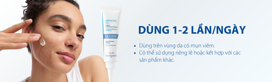 – Thoa kem Keracnyl PP+ 1 đến 2 lần mỗi ngày lên vùng da có mụn đã được làm sạch và lau khô.